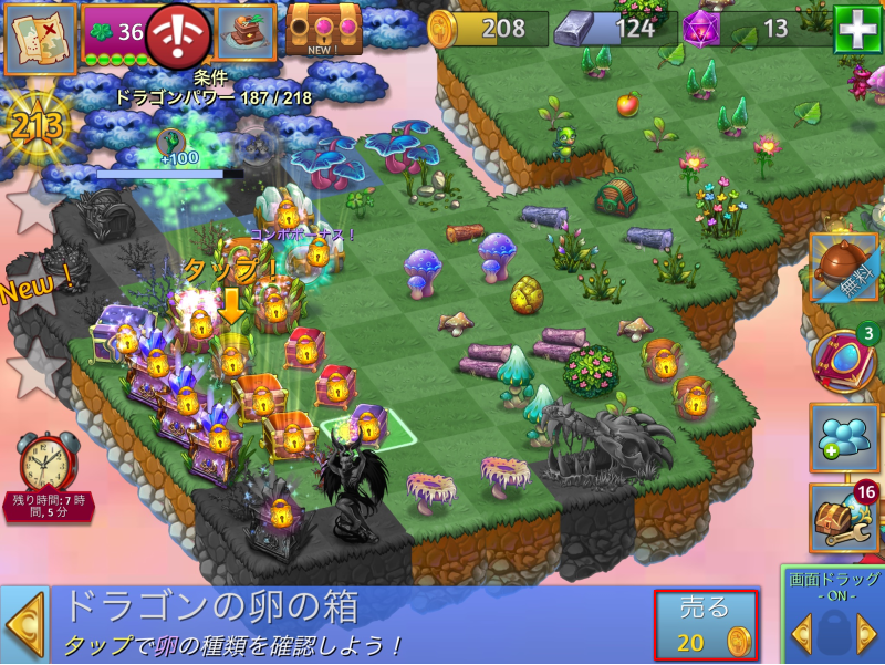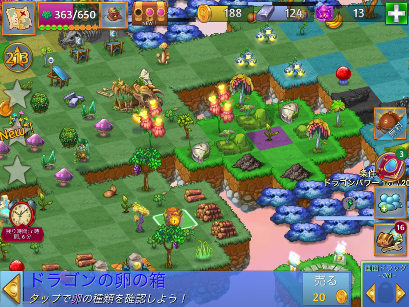 植物、建物、コイン 、宝物、落下星、魔法のオブジェクトを3つ繋げて進化させて、